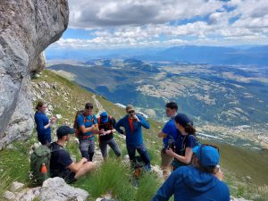 In true military fashion the transportation departed Leuchars at 0200 meaning most people only had about 4 hours of sleep. Travelling at night was a first for many of the group who had not experienced travelling and operating whilst fatigued only to arrive in a foreign country with a different time zone, much hotter and more humid climate with different food and a different language. All experiences directly transferable to deploying on operations as a member of the UK armed forces. The next challenge was driving on the other side of the road around Rome on their version of the M25 where the only rule of driving is ‘there are no rules’. Thankfully, all our drivers had completed additional training in advance to prepare them for driving on the continent. They were able to negotiate the tolls and tunnels to safely find their way to our first destination, the hillside city of L’Aquila. A very basic motel with no air conditioning and temperatures above 30C but a welcomed shower and soft matress. After a hot night, we set off higher up the mountain range then left the cars parked and hiked onwards and upwards to our home for the next few night, the mountain hut called Refugio Duca degli Abbruzi (named after the famous Italian leader who was held prisoner nearby). The students had to carry 5 litres of water each at altitude which made them realise how thin the air was going to be for the next few days. The afternoon was spent summiting a nearby peak (Pizzo Cefalone 2533m) to gain further acclimatisation with the terrain, temperatures and altitude. Our bunk room was very cosy (cramped) each night and despite the snoring everyone was so exhausted they slept well.