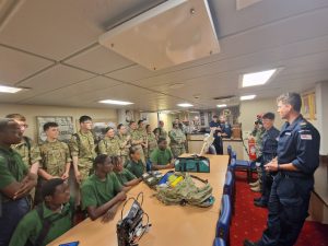 During the first three days the Cadets’ feet hardly touched the floor. It started with a visit to the British warship, HMS MEDWAY and a tour of all decks and capabilities, particularly as the ship had scored notable successes against drug traffickers in the Caribbean the previous week and the Cadets had the opportunity to handle both the weaponry involved, put on fire-hazard suits as well as sit in the Captain’s chair on the bridge! The Cadets were joined by a group of 10 ABDF Cadets on board which was the first opportunity to begin making new friends. The Commandant, meanwhile, checked the party in with the British High Commissioner and with the Resident British Commissioner, H.E Lyndsy Thompson, without whose help and invaluable support the trip would not have been possible.