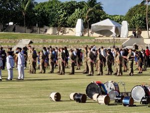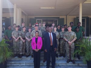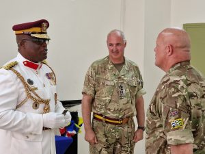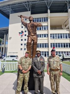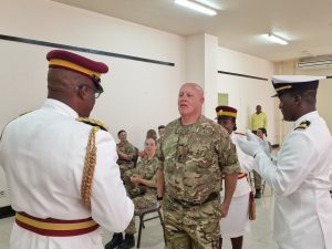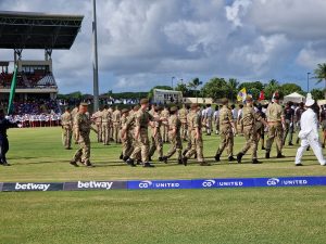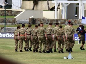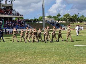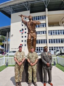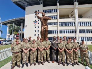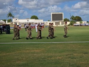 And then came the big day during our visit to Antigua and Barbuda – being invited to march-past in the Sir Vivian Richards National Stadium in front of 2,000 guests on Antigua’s Independence Day on 1st November. The day was a scorcher, probably a few degrees warmer still inside the stadium, and reveille was called at 0430 hrs by the RSMI, WO1 Gerry Garvey. SMIs Julie Slater and Sandra McDowell had practised their drills and medical support to the group in the days running up to the parade. The contingent was preceded by the Antigua and Barbuda Defence Force band and the parade took on a Caribbean festival atmosphere as we marched-past in slow and quick time, also appearing on Antigua’s National TV channel! The Cadets were simply fantastic – smart, resilient, inspected by the Governor General on his walk through the ranks and did UK plc proud as the only non-Antiguan group on parade and in front of our own Resident British Commissioner and other diplomats, including the US and Chinese Ambassadors.