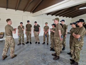 Towards the end of the first week, HMS MEDWAY departed for Montserrat, leaving behind its Support Troop from 56 Engineer Regiment, commanded by Capt Seb Cooke RE. The Troop very kindly gave up a day of training to work with the Cadets, doing fieldcraft and sniper stalk drills at Camp Blizzard, a training area on the northern side of Antigua. A fun day to end the week apart from the coach breakdown on the way back to camp, resulting in a 2 hour wait but the road was next to another fine Antiguan beach, so not all was lost, apart from evening meal, giving the Commandant the perfect excuse to buy seventeen takeaway pizzas!