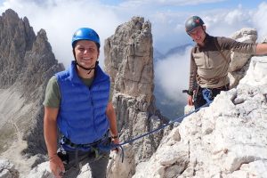 On day one I was paired with my instructor and climbing partner for the 2 weeks. We started off refreshing our memories of the basics on an outdoor sport climbing wall; tying in and climbing techniques. Throughout the two weeks we progressed much faster than I had anticipated and before I knew it, we were halfway up a multi pitch route Torre Quarta Alta in Cinque Torri.