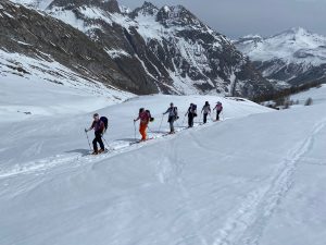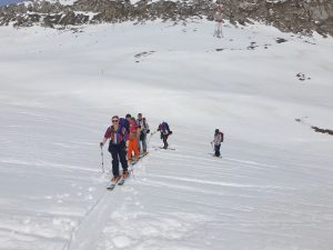 After a 24 hour drive from Nottingham to Val d’Isère, we arrived eager to get stuck in to a week of adventurous training in the Alps. We were greeted by an end-of-season flurry of fresh snow despite the warmer weather and after kit issue and some evening lectures on avalanche awareness and the aims of adventurous training, we settled down for the night in the UCPA hostel.