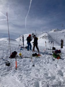 Day 2 was spent mostly off-piste where we were taught techniques such as stem turns, jump turns and kick turns. We also talked about our avalanche transceivers, probes and shovels, and practised a group rescue. We learnt how to locate a buried casualty and how to dig them out safely and efficiently.