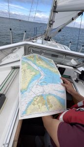 Day 5 – We completed some light wind sailing and motor sailing from Cowes to Port Solent. We also learned how to make a pilotage plan and follow it so that we stayed in water deep enough for the hull of the boat and to help map our route into the marina.