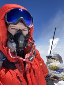 We woke to almost calm winds and quickly and efficiently got underway, across the hard flat ice of the South Col. Soon we were on the steep snow slopes which would take us to the Balcony at 8400m. Here we would stop for a few minutes to fuel and hydrate, change our oxygen bottles, and as the sun rose we got our first glimpse of the surprisingly steep and exposed summit ridge. From view was spectacular and through poking through the blanket of cloud below us were the summits of Kanchenjunga, Lhotse and Makalu – the 3rd, 4th, and 5th highest mountains in the world.