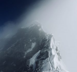 From the Balcony the route follows the Southeast Ridge, along a mix of knee-deep snow and rocky outcrops, to the South Summit of Everest at 8750m. I had read from here that Everest climbers know that the summit is ‘in the bag’, but I wasn’t so sure. The wind was picking up and the clouds began to swirl around us. I could feel the air temperature drop dramatically. We changed Oxygen bottles for the final summit push and discovered that my new bottle had leaked – leaving me without oxygen for what seemed like an eternity as we worked the problem, eventually finding a bottle that, if used sparingly, had sufficient oxygen to get me to the top and back to the South Summit at least. It was a desperately uncomfortable few minutes, and I couldn’t help but think back to my previous attempt on Everest which ended at a similar altitude when my oxygen system failed completely. Looming above us was the famous ‘Hillary Step’. This now seemed like an impassable obstacle, a near vertical rocky and icy climb at around 8800m. From my vantage point I could make out a dead body at the bottom of the Hillary Step, one we would have to step over to tackle the climb. The situation looked desperate.