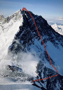 We continued out of Camp 3 on the Lhotse Face in a steep upward traverse and through the awkward mixed rock and ice of the Geneva Spur. As we round the top of the spur we get our first glimpse of the South Col, a large flat area of ice at 8000m upon which Camp 4 is situated. This desolate, windy, and inhospitable place will be home for just for several hours until it is time to set out for the summit. Here we melt snow to hydrate, prepare and check our equipment and try to get a few hours rest. From here, at and above 8000m, we are in the ‘Death Zone’ – where the pressure of oxygen is insufficient to sustain human life. If it was possible (and it isn’t!) for a helicopter to land an unacclimatised person here on the South Col without oxygen they would fall unconscious within a few minutes, and death would soon follow.