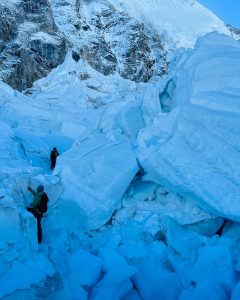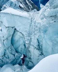 Despite having to delay our summit attempt by 2 days due to challenging weather conditions, the expedition went according to plan. The pre-acclimatisation process worked well, and I arrived at base camp (5300m) ready to go. The process of climbing 8000m peaks involves a series of ‘rotations’ up the mountain, gaining more altitude with each multi-day foray above base camp, as the body adapts to the thin air. The lightning ascent did not mean that I moved faster than others on the mountain, rather it involved reducing the number of these rotations. This not only saved time, but it reduced the number of times I had to climb through the dangerous Khumbu Icefall – a tumbling glacier which claims the lives of mountaineers and sherpas every year. The cacophony of tonnes of crashing blocks of ice in the icefall and the swooshing of avalanches was a constant companion in base camp and on the lower reaches of the mountain.