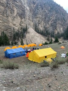 After the optimism of reaching Camp 1 and completing all of our load carries in great weather, we are dealt a huge blow in losing one of our rope leaders, Gaz. Severe D&V overnight complicated by the altitude meant we had been advised by our medical support in the U.K. that we needed to evacuate him to a hospital. However due to our very remote location and the fact that the nearest airstrip was 5 days trek away meant the only option was to get a helicopter into BC to extract him.