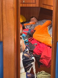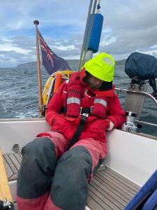 Unfortunately, the team missed a tidal gate which stalled the passage but allowed a few hours respite for all. The skies cleared and a school of dolphins came to feed around the yacht. When the tide began to change, Petrel was back in action. Maj Common and Maj Boardman, two of the runners had been fairly unwell until this point and now Capt Morris was nil by mouth. In any case, the former runners completed the Paps route on Jura, which included several tough inclines over scree and rocks. On return to the boat, Petrel started making progress towards the dreaded Mull of Kintyre. By this point, the sailors were exhausted, and runners had to take the helm at various times to allow them to take much needed rest. Lt Col Reid began his own personal morale battle as a broken stove meant no more of the black tea he subsides on. The chinks in his armour began to appear and occasional pleading cries of ‘teaaa’ came from the helm throughout the night. To add insult to injury, we had also finished the chili that had fuelled us for the past few days- so not only was there no more hot food due to the gas shortage, but there wasn’t much to eat altogether.