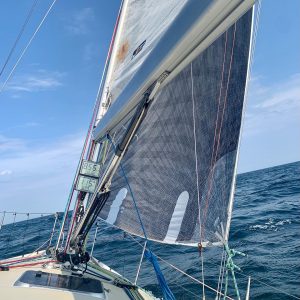 A good start saw the crew keeping pace with other similar yachts right across the English Channel. Navigating the busy shipping channels north of Cherbourg and Alderney provides a real challenge because action taken to avoid ships can have a significant effect on the time taken to cross the channels, and a constant lookout is required from all members of the watch to keep the skipper/mate informed throughout.