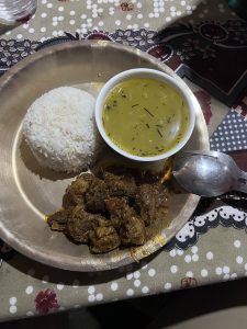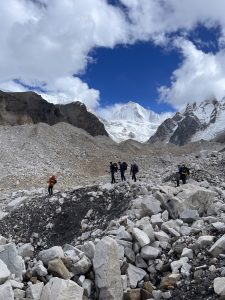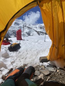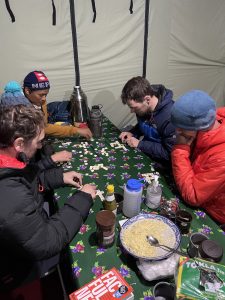 Upon reaching base camp the team had a period of well earned rest and recovery from the long trek into base camp. This allowed the expedition leader and instructors to plan for acclimatisation and summit rotations on the mountains whilst the team conducted final kit checks. Meals were cooked by the base camp staff in the kitchen tent – it’s amazing to see just what amazing meals could be cooked above 4000m! They worked incredibly hard to keep us fuelled for climbing on the mountain. ‘Dhal bhat’ is a traditional meal compromising of lentils (dal) and bhat (rice) and is considered to be the national dish of Nepal – one we would have regularly! An evening’s entertainment at base camp would be spent playing a competitive game of banana-grams or cards!