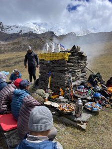 The team spent a couple of days refuelling, planning and also conducted a Puja ceremony. The Puja is an important ceremony where respects are payed to the mountain and blessings are offered for safe passage before heading up onto the mountain. Our Puja consisted of the Sherpas, base camp team and our entire climbing team participating in prayers, rice and flour throwing. The stupa was covered in beautiful decorations, plates full of food and offerings. It was a truly incredible experience to be a part of.