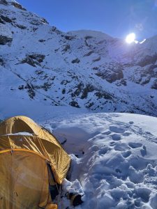 The climbing strategy on the mountain included two high camps – Camp 1 (5430m) and Camp 2 (6000m). This climbing route sits on the northwest face of the mountain and only receives sunlight around late morning to afternoon, as such the mountain is renowned for being one of the colder peaks. Himlung Himal is both a physically and mentally demanding mountain given the distances travelled, height gained (including a long summit rotation) and its remoteness.