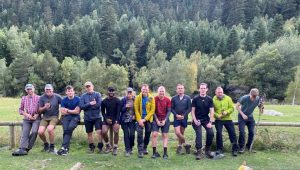 Day 4 trek – 19 Sep The trekking party of 12 were dropped off at the start point in Saint Girons, by the Pont de le Chemin de la Liberte for the obligatory start team photo. With the weather still very warm, 2 groups headed off: the SMF group with the Mountain Leader (ML) and the remainder who were a little more experienced with the MLTs. It was a long day’s walk, heading out through the forested foothills, and covered about 24km and an elevation gain just over 1000m.
