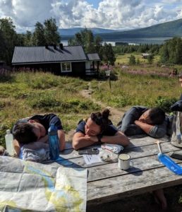 Our trek began from Kvikkjokk where we would follow to Kungsleden with our homes for the expedition firmly strapped to our well-packed rucksacks. The trek took us through some of Swedens most beautiful terrain, peaked snow-capped mountains and large glacial lakes which throughout the trek were frequented by those willing to brave to cold plunge. In trekking style our campsites were pitched along the side of the trail at well frequented locations, regularly along with fellow trekkers from several other countries such as Germany, Netherlands and even Ireland. Fuelled by ration packs and plenty of sweets, we made great progress along the trail however still rewarded ourselves with stops at the refuges located at intervals along the trail for those who required more advanced facilities. These refuges, typically only accessible by foot or helicopter, were oasis of Swedish culture with accommodation and some even a sauna. At these refuges we could once again engage with Swedish culture and experience for a short period of time, a way of life very much off grid, even meeting local Sami tribespeople.