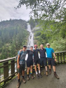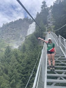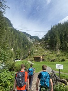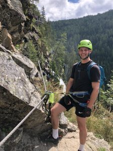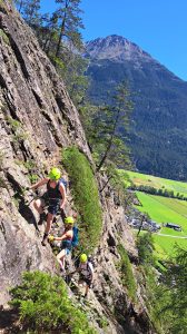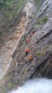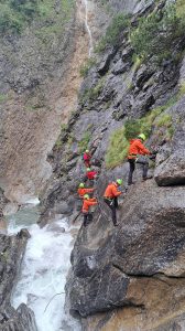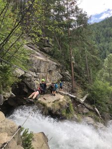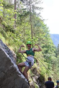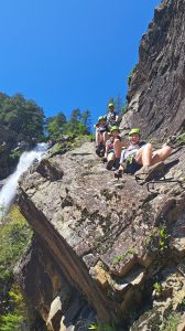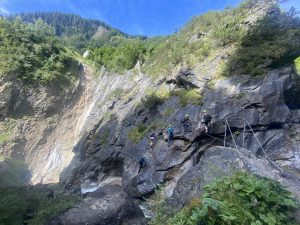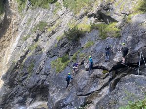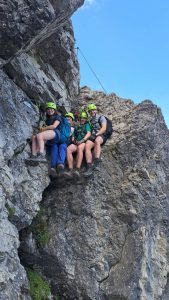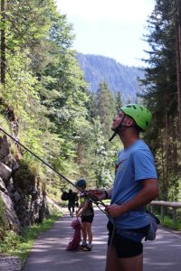 Our third klettersteig route delivered these challenges in abundance. Today was the Tegelberg route next to the famous castle featured in the famous film ‘Chitty Chitty Bang Bang’. The grade edged up to a C and the climb increased to 350 metres with a total ascent of 800m. Just like yesterday the route was very busy and when we walked to the start of the route a queue of around 50 people and half an hour had formed. The reason for the queue became obvious when we saw a 10m ladder followed by a traversing section (highly polished, as we would find) that some people were getting a look at and then coming back down the ladder. Fortunately, all of our group made it across the polished section which was probably the most difficult section of the route. What did cause us a problem today, however, was the cumulative effort of the climb as some group members grew weary as the climb seemed to go on forever. We tried to move as quickly as possible so as not to hold up the people behind, or to let them past wherever possible, but this really felt like a much bigger undertaking than the preceding days. Again, our timing was much slower than the guidebook said and this was partly down to queueing and to the relentless sun on such a hot day. Due to the arduousness of this climb the group discussed the following day and decided to spend the next day single pitch climbing. We learnt to lead climb outdoors here which is a great achievement so early in climbing for some people. This gave our legs and biceps a day to recover but was a real workout for our grippy finger muscles and also for our brains when concentrating on the lead climbs. The following day was back to klettersteig, this time on another grade C and 400m climb, right next to a thundering waterfall on the Stuibenfall route. This even included a wire bridge right over the top of the waterfall with it tumbling down the gulley beneath. Everyone cruised the route today and we all really felt we could do anything.