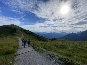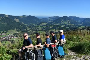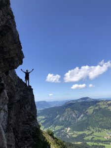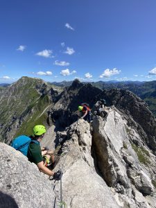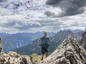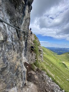 These themes really came into focus as the expedition took a big step up on our second klettersteig route, the Eldrid route again at Oberjoch. This time the route was again graded B/C but the height gained was 300m with an overall time of 3.5 hours predicted in the guidebook. It also provided our first chair lift to get to the start of the route and then descend at the end of the day. While using a lift seems a little like cheating to those of us used to the British mountains, it does allow more time climbing and we all agreed that the phrase ‘when in Rome’ applies here. The route actually took us much longer than the guidebook said, at nearer 5.5 hours due to the route being crowded in the German holiday season and because we took a longer route down to take in more of the scenery. Another new discovery today was our first alpine cross, typically a white metal crucifix on the top of a prominent mountain, so we had a team photo to celebrate our ascent.