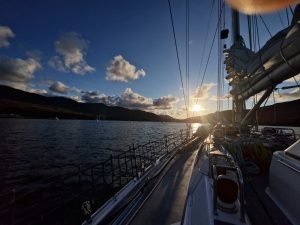 Over the next few days, we honed our sailing skills, learning to tack, jibe, helm, and trim the sails. We also enjoyed a fun game of “banana squeeze” and a memorable evening in Tobermory (or Balamory, as some of us fondly remember it). The spectacular sights of the Slate Isles and the Corryvreckan whirlpool were highlights during this part of our voyage.