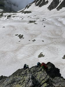 Wiwanni – 21-23 June: With the challenging snow conditions, we opted to stay a bit lower and chose the wonderfully named Wiwannihutte as our next venue. This hut was smaller and more basic than the Cabane de Moiry, but as the only guests on our first night, we were very well looked after. The next day, we climbed the Wiwannihorn via its Southwestern flank and descended its Western ridge. Most of the routes were on really good rock with a small technical aspect to them, which allowed us to demonstrate techniques that were not needed on the Pigne de la Lé.