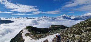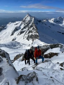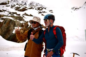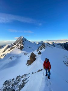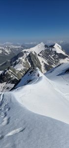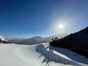The altitude seemed to make a couple of the team’s snoring even worse and with breakfast at 4:00 am, it was hardly the greatest night’s sleep for the day’s exertions! The students had already learnt loads and we started slickly, being the first out of the hut. It is a long ascent to the summit, with the first part of the South-southeast ridge being a bit of a trudge. Fortunately, the ridge becomes much more interesting the higher you go with some rock steps before an amazing, knife-edge snow ridge to the summit. The ridge is on the border of Switzerland and Italy, and it is not a joke when briefing that: if someone falls into Italy the other must jump into Switzerland so that the rope between them keeps them safe!