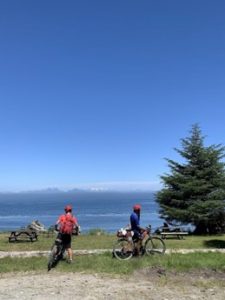 Unfortunately, the grocery store in Tahsis did not have much of the kind of food we needed for our next two days of bikepacking. The campsite was situated on the shore of the Tahsis inlet surrounded by mountain peaks. Once the tents were set up we went for a swim and shower before washing our clothes at the campsite facilities. From the campsite we saw more bald eagles as well as some playful sea otters and seals. The route and view can be shown respectively below.