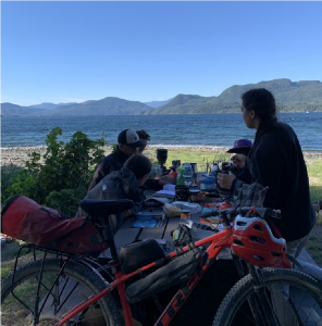 We set off from Elk Falls early as we had a long distance to cover in order to reach Gold River. Students paired up to take turns researching the route and navigating. We navigated using the app Ride with GPS.(The recommended App by BikePacking.com, ensure you download the route before setting off) The start of the route was incredibly hilly, but we managed to maintain a good pace along the highway. The highways were more difficult psychologically, as the views were repetitive, and we had to stay in single file. Unfortunately, we ended up having to stop for over an hour to sort out issues with the bikes. We had a few punctures and some of the panniers started to break. After damage control with zip ties, we rearranged our kit, putting thought into balancing the weight equally over the whole bike to minimise the strain on individual bags and straps. In hindsight, we wished we’d done a bit more training and preparation on bike-fixing.
