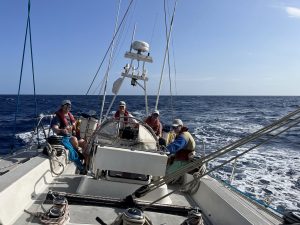 Under the cover of night, we practiced our sailing drills, manoeuvring the Yankee and adjusting the main sail’s reef status. The following morning started with a breakfast of pancakes, accompanied by the joyful sight of dolphins and pilot whales gliding beneath the boat.
