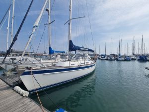 Once the morning’s maintenance was complete, Maj Hackett outlined the plan for the week ahead as we would be covering the RYA Competent Crew syllabus for the novices and RYA Coastal Skipper course for our Mate. We then slipped from our marina and headed into the harbour where we put the sails up and did some tacking and gybing drills – essentially turning the boat! We picked up a mooring buoy for a very civilized lunch before talking about the points of sail and steering the boat.