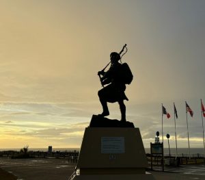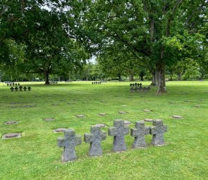 After breakfast at the campsite café, we proceeded down to Omaha beach. The route was easy going along the coast and, at the end of the beach, we met our first hill of the day that seemed to go on forever. Once up, we continued on public roads until we arrived at the Overlord Museum. There were no takers for the Euro 19 entrance fee, so we continued on to the American Cemetery. Once the tour was completed, we continued on to the British Memorial at Ver-sur-Mer. The memorial had just been upgraded as the 80th Anniversary of the D-Day Landings was the week prior to our visit and had over 1700 steel silhouettes overlooking Gold Beach.