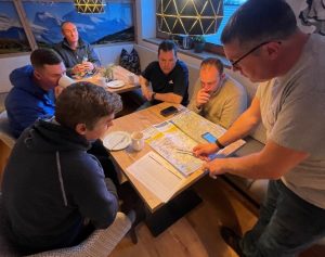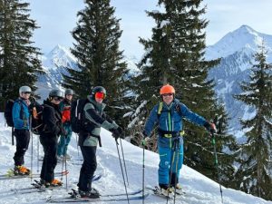 The SF3 ‘heroes’ (self-labelled) were the busiest of all. Not only did they develop their skiing both on and off piste, but they also had to construct a snow shelter and make a Rutsch-block to review and test the snow stability. This is an important element to ensuring the touring environment is as safe as possible. Not an easy feat, the block needs to be a minimum of 2m wide, 1.5m deep and 1.2m tall on a slope of around 30 degrees. This allows for a visual check of the snowpack and a physical test involving a student mounting the block and jumping up and down on it. This will physically demonstrate stability of the snow and inform the tourers of the state of the snowpack. Once the practical lessons were done, a day tour was conducted prior to planning for an overnight tour that would see the SF3 group away from the accommodation and staying up in the mountain for a night. After the students, under the watchful eye of the SF3 instructor Maj Chris Sharpe, planned their route, each doing a leg of navigation and completing the routes cards, they packed their kit and prepared for the adventure. A day of climbing, an overnight stay in an austere hut saw them refreshed to attack the immediate summit and then let gravity do its thing. A great experience and a lot learned by the students.