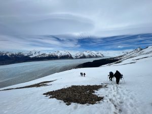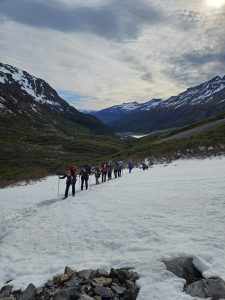 A shorter day was welcomed by many within the group, and the first experience of how quickly the weather can change, and as such the associated dangers, were discussed. High winds, evidence of rock and tree fall, and varying temperatures lead perfectly into the evening lessons. On approach to the campsite, they had the first glimpse of glacier grey. A Huge glacier covering the side of the mountain and stretching into the lake below. The winds on approach were the highest they were to experience, and many had to launch into the mountain to keep from blowing away. Luckily, the only victims to the wind were Sgt O’Sullivans beloved hat and Capt Kelly’s quiff. Camp Dickson was basic but provided good shelter for cooking. Blister tally remains at 2.