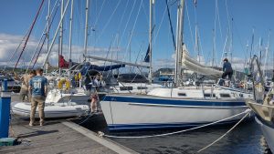 We started off our day with a speedy sail up to Tobermory – racing the other boats up the Sound of Mull to secure a spot in the marina before the storm rolled in! On our way up we practiced a few knots and executed our first gibe of the expedition. We reached Tobermory in the early afternoon, having had soggy wraps in the drizzle for lunch before squeezing into one of the last spots in Tobermory marina!