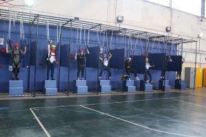 Next, they moved on to practicing entering and exiting the aircraft. The training wing featured large openings that simulated aircraft doors. They were instructed on how to enter, connecting their tethers and ensuring they were secure. With their instructor by their side, they shuffled forward to the front of the “plane,” ready for the next stage.