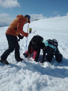 All team members were trained to a minimum of Ski Foundation Level 3, which meant everyone had prior experience with the British Military skiing off-piste, ski touring and conducting avalanche rescue training. All members were equipped with avalanche transceivers, shovels, and probes, with additional safety equipment assessed for each training day. Avalanche risks were carefully monitored using snowpack tests and weather forecasts. Detailed map study, combined with consulting the IMO avalanche bulletin and weather conditions were used to select the appropriate route for specific training objectives throughout the trip.