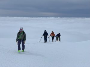 Given a choice of teams for Sunday’s ski tour, we decided on girls vs boys for a bit of friendly competition! This day provided the toughest ski conditions yet, with poor visibility and ‘grabby’ snow for the majority of the descent back down to the roadside. However, it was necessary training that gave us another 800m of vertical ascent and some tricky descent experience under our belts prior to the upcoming big day – the summit attempt.
