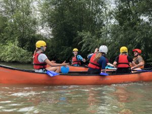 Day 1 started with a safety brief, safety kit fitting and familiarization with the site and equipment. The cadets then had taster sessions in open canoe, kayak and paddleboard delivered by the two coaches Flt Lt Hill and CI Osborn with help from Flt Lt Beal. The sessions were a mix of skills learning and games to consolidate the skills on a moving water environment, with cadets rotating between the craft throughout the day. The weather was kind and meant there was an opportunity for some jumping in from an oversized paddle board on reaching the school pontoon and camping area. The day ended with a trip to the school for showers and then shopping for a well-earned BBQ.