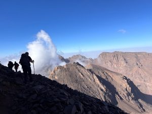 Having trekked for 8 days (with a day’s administration break) and been to a maximum height of 3017 meters, we were now ready to take on the Toubkal challenge, the first stage of which was to hike up to the Toubkal Refuge which sits just over 1000 meters below the summit of Mount Toubkal. The refuge itself is a large imposing building and is extremely busy, with a near constant flow of trekking teams heading up and down the mountain (at all hours of the day). We are now sleeping at above 3000 meters which for many was a strange experience, sleeping is a little more difficult and any movement really gets the heart going.