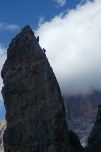 The via ferrata groups enjoyed completing the nearby routes, including some of the original via ferrata trails, complete with tunnels and building remnants from the First World War. Each day their confidence and competence grew, enabling them to tackle more difficult wires, facing steeper terrain and needing to learn better climbing technique in order to complete them. In the same area as the climbers, these groups also summited Sass de Stria and other surrounding mountains and felt incredibly privileged to be able to conduct this ALeRT training in such an impressive landscape.