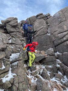 Throughout the week, we broke down into small teams, with some winter mountaineering (i.e. hill-walking but in winter conditions, with an axe and crampons) and some winter climbing (i.e. climbing roped together with 1 or 2 others and using two axes). The greatest challenge was the weather (relative lack of full-on winter conditions) which made the instructors earn their money! Locations used ranged from Munro-bagging and multi-day trips in the Cairgorms, to long climbing routes on the NE Face of Ben Nevis, to shorter routes in Coire an’t Snaechda, and even some ‘dry tooling’ and indoor climbing when the weather was truly inclement. The Ulysses Trust grant enabled us to be more flexible with choosing suitable venues and two rope-teams stayed in the CIC Hut (Ben Nevis) for most of the week.