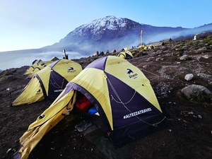 After flying from Manchester, we were welcomed by Altezza Travel and taken to their hotel for admin checks before the climb. Preparations included equipment checks and a shakeout hike in Materuni village. This short excursion included a visit to a local waterfall and a tour of a coffee-producing village, where the team was introduced to Tanzanian singing and hospitality. The comfort of a bed and a toilet lasted for only two nights before we embarked on a 7-days expedition into the mountain.